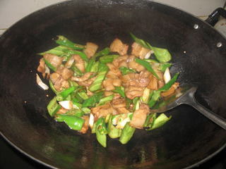 等到辣椒炒至表皮有点快糊的时候,下肉一起炒匀。