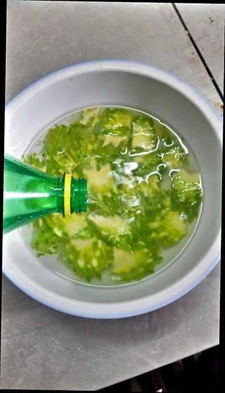 先苦后甜,后味是甜的,特点脆爽 主料苦瓜(两根)雪碧(一瓶)调料无厨具其它 1 这个菜很简单,只要准备雪碧和苦瓜就行了 2 把苦瓜洗干净了切开 3 取出苦瓜子 4 这样片成片, 5 再用雪碧寝泡,5分钟左右 6 在拿个米碗倒上雪碧, 7 最后装盘,把雪碧放在边上,就好了 小窍门: 苦瓜要买直一点的好切,苦瓜去取子时把白的去干净,片尽量薄点。