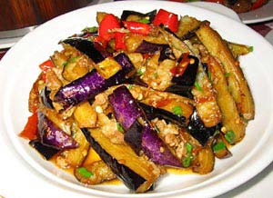 4、锅内放入两勺油,先爆辣椒和蒜,再放入肉丝炒至变色,然后放入炸好的茄子,加酱油、糖、酒和少许调味后,出锅盛盘。