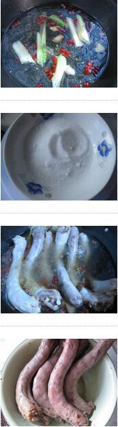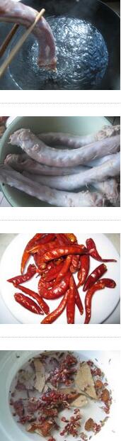 6. 坐锅倒油烧至3成热时候放红椒,姜块10克,,葱10克,稍炒后加入调料水,倒入鲜汤,加盐20克,味精3克,烧开,小火熬煮大约2小时