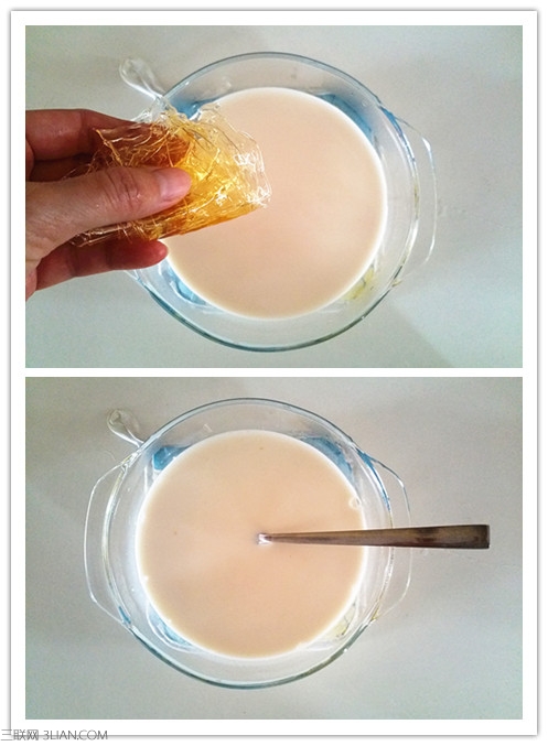 1.吉利丁事先用冰水泡软,牛奶加入细砂糖后放入微波炉里加热至40-50度,时间约1-2分钟。