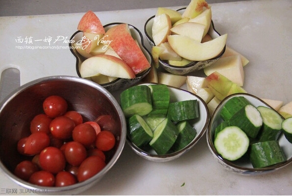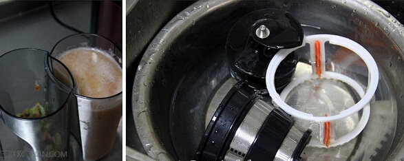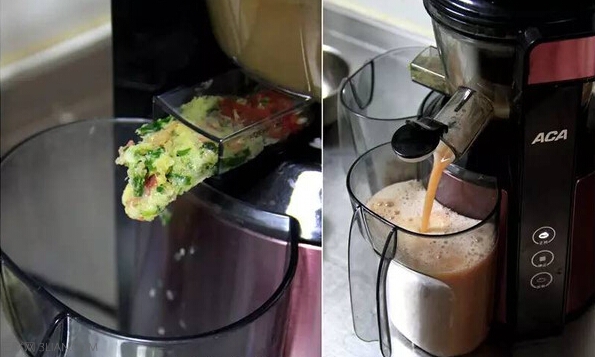 材料:桃子三个,圣女果少许,黄瓜两根 步骤: 1、将圣女果,黄瓜,桃子都洗干净,然后圣女果去蒂,黄瓜切段,桃子去核儿。 2、因为是混合果汁,启动原汁机后,三种果蔬可以混着放进去。 3、左边出渣,右边出汁啦 4、看一下最后的渣和汁,出汁率很高。原汁机的清洗也很方便,零部件拆开后一冲洗就好了,比传统榨汁机方便很多。 果汁榨好后就尽快喝吧。我一般喜欢把果汁倒进饮料瓶密封然后放冰箱里冰镇一下再喝,口感更好。但是新鲜果汁存放不了太久,最多到第二天就赶紧喝掉吧。