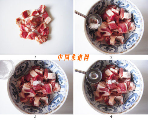 1.羊腿肉买来用水清洗干净,用厨房纸擦干表面的水分。用刀切成2厘米长和宽、半厘米厚的肉块。