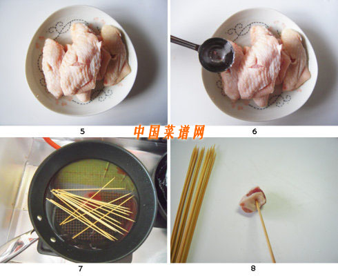 10.在每两根竹签子上分别穿上两个鸡翅中。