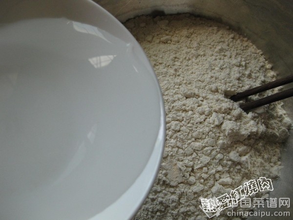 1.将水慢慢加入面粉里,一边加一边用筷子搅拌,等到面粉都成为穗状就用手和成面团
