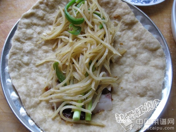 14.上面再放上炒好的各种蔬菜,我今天犯懒只做了一个炒土豆丝,其实鸡蛋韭菜,豆芽粉丝卷进去更美味