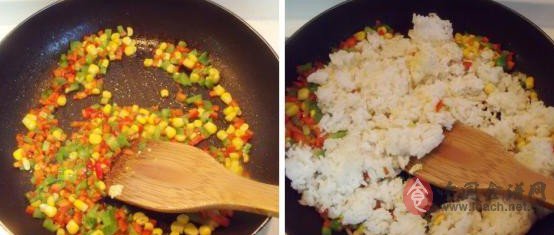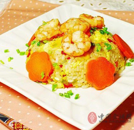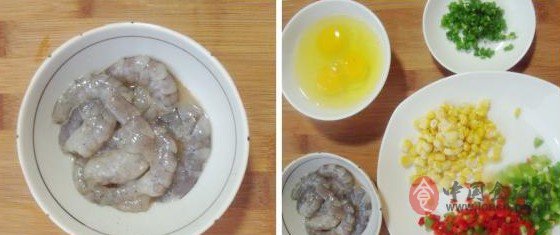 材料:虾10只,鸡蛋三个,玉米粒,青椒红椒,香葱,淀粉,盐,胡椒粉,米饭二人份。做法:1、 虾去头去尾挑去虾肠,只取虾仁,加料酒,盐,胡椒粉,少许淀粉拌匀腌制。2、 准备炒饭的材料:鸡蛋加少许盐打散,青椒红椒切小丁,香葱切碎。3、 锅烧热加油,将虾仁倒入翻炒至表面变色后捞出。4、 锅中余油将鸡蛋划散,凝固后即盛出。5、 再倒油,油热后将青椒红椒玉米粒一起下锅翻炒。6、 加入米饭不停翻炒,至饭粒干爽颗颗分明。7、 加入炒好的虾仁及鸡蛋。8、 加盐调味炒匀后撒入葱花出锅。