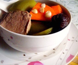 青红萝卜猪腱汤的主料:青萝卜250克 红萝卜 250克 猪肉 400克 青红萝卜猪腱汤的调料: 陈皮1小块蜜枣4粒杏30克 青红萝卜猪腱汤的做法 1、青红萝卜去皮,洗净,切块;陈皮泡软,洗净;蜜枣、南北杏分别洗净,备用; 2、猪腱肉洗净,切大块,放入开水中煮片刻,拿出来用清水冲洗干净,沥干水,备用; 3、清水1800ml放入汤煲里,待水滚后再将所有材料放入,以大火煮开,转为小火,再煮两个小时,放盐调味即可。