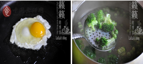 4.平底煎锅煎制荷包蛋,将青豆及西兰花入锅氽熟,铺盛在面碗里;肉骨汤煮滚加入盐、胡椒粉调好味浇淋在面碗里,上桌开吃。