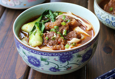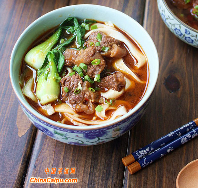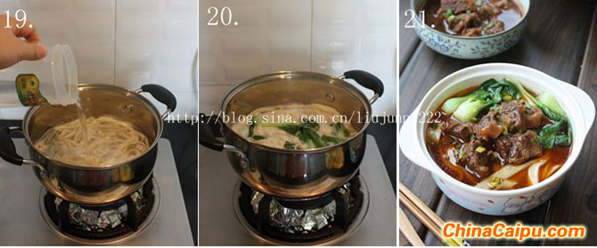 21.将煮好的面条与青菜放入碗中,放入烧好的牛腩及牛腩汤,撒上葱花,即可食用;
