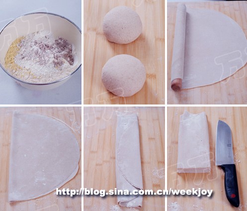 1.所有粉类混合,加盐,加水和成硬面团。揉匀后饧面30分钟,若时间足够可以再揉一次,再饧面30分钟。