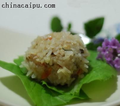 6、最后一个步骤就是用手捏丸子啦,肉丸的个头不能太大,否则不利于蒸透,我捏成了乒乓球大小,再放到糯米里滚一滚就可以啦。摆盘的时候放一层荷叶或者粽叶垫在下面,可以防止粘碗底,蒸出来也会带一种清香