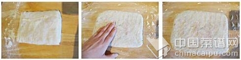 2.炒锅放2勺油烧热,下几粒花椒爆香后捞出关火,稍后把油浇在肉馅上面的五香粉和葱姜末上,把馅拌匀;取50毫升清水分三次倒入肉馅中,并顺着同一个方向搅拌肉馅,每次都要等清水完全进入肉馅中再加下一次继续搅拌,这样做出的馅,肉质鲜美多汁,这样馅就拌好了;将醒好的面团放在案板上揉至表面光滑,分成两份,取其中一份,沾少许面粉用撖面棍压着面团朝四个角撖,很容易撖成长方形