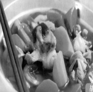 5.向汤中加入萝卜(注意:萝卜大块只能将舀些汤出来再加进去)