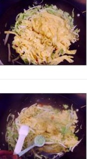 食材明细:烙饼适量 白菜适量 鸡蛋适量 红辣椒适量 葱 适量 姜 适量 盐 适量 鸡精 适量 制作步骤1. 将烙饼切成丝备用。2. 把切好的饼丝放入大碗中,磕入两个鸡蛋。3. 放丁点盐搅匀备用。 4. 白菜洗净控干水分后切成细丝。5. 葱切葱花。6. 姜切细丝。7. 红辣椒切小圈。 8. 锅中倒油,待油8成热时放八角,再放入葱、姜、辣椒爆香。9. 倒入切好的白菜丝翻炒片刻。 10. 再倒入用蛋液浸泡过的饼丝。 11. 小炒一回后加盐、鸡精调味即可。小贴士炒饼的过程中不要添加水。