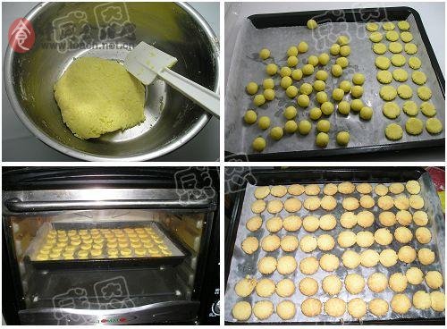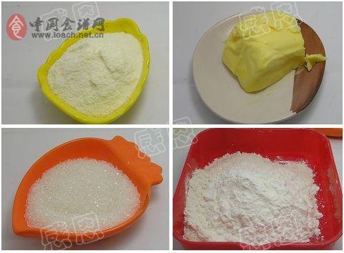 原料:黄油 60克 熟蛋黄3个 糖 35克 奶粉 30克 低粉 40克 玉米淀粉 50克 做法: 1.奶粉 2.黄油 3.白糖 4.低粉和玉米淀粉。 5.蛋黄三个。 6.将黄油和白糖一起打发。 7.打发好的黄油和白糖。 8.加入过筛的分类和蛋黄。 9.和成面团。 10.团成均匀的小球,然后按扁装盘。 11.烤箱170度10分钟,然后调温至150度10分钟即可。 12.出炉晾凉,封装食用。