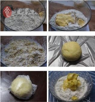 1、水油皮:面粉加糖加软化的黄油搓成颗粒状,再加水和成光滑的面团。水不要一次加入,可以边加边试面团的软硬程度,面和到比普通面团稍微软点就可以。