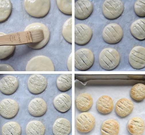 10,用刀片在饼的表面划三刀口子,划破表面即可。