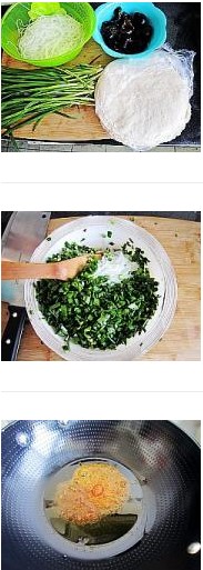 2. 韭菜洗净切碎,再把粉丝木耳切碎放入盆中。