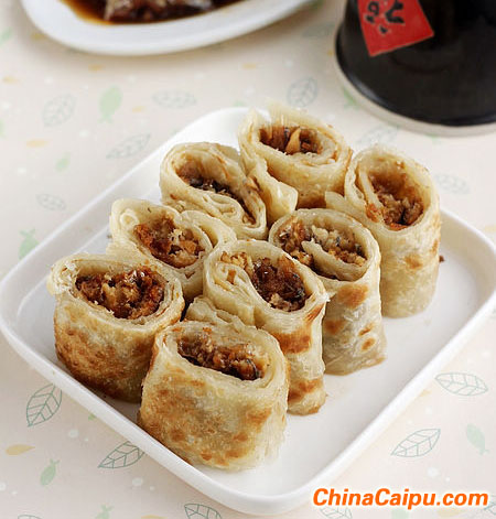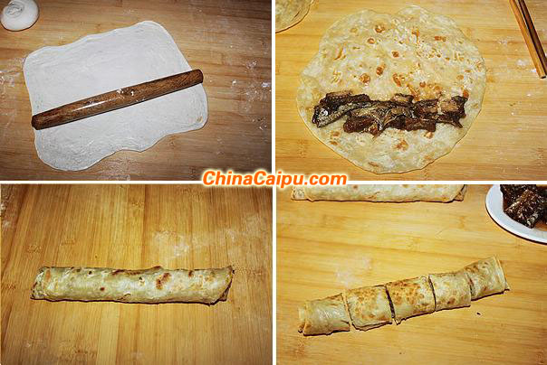 18、取一个卷好的面团擀成薄饼,然后放入锅中两面店铺都淋上少许油烙成金黄色;