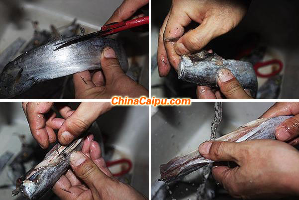 5、带鱼也可以提前做,将带鱼剪去边上的鱼鳍,然后剪去鱼头和鱼尾;