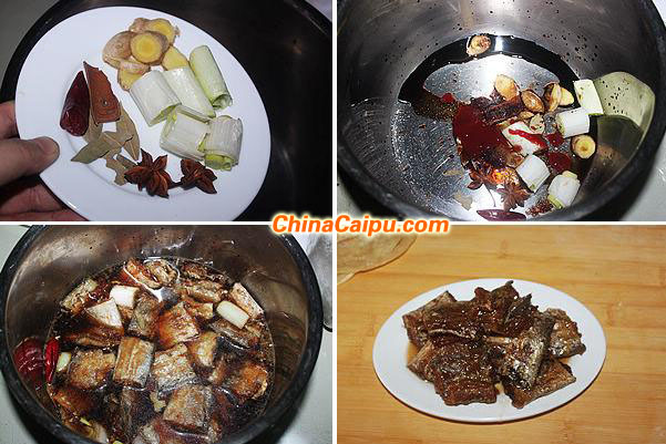 11、将葱段、生姜、八角、香叶、桂皮、辣椒倒入高压锅中;
