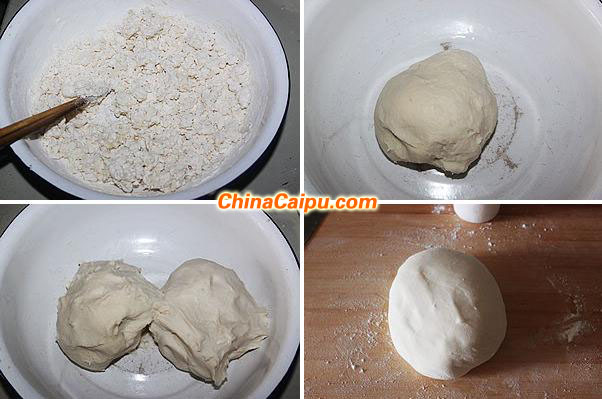 4、不同面粉的吸水量是不同的,总之就是和好的面团一定要非常的柔软,面团饧的时间越长越好用;如果用面包机和面,先把200克面粉放入面包机然后边倒开水边用筷子搅成小疙瘩,然后启动和面或发面团程序搅拌成光滑的面团(大约10分钟)关上程序,然后放入剩下的200克面粉,再倒入凉水,在开启面包机的和面程序将其搅拌成光滑的面团(大约10分钟),然后关闭程序,盖上面包机的盖子,让面团饧半个小时以上;