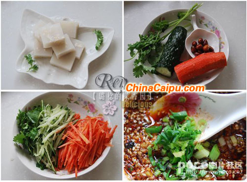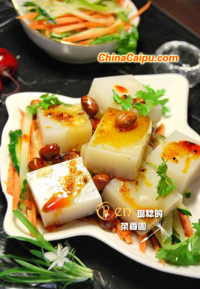 胡萝卜丝和黄瓜丝、香菜段码在盘子底部,肉皮冻叠放在上面,将料汁浇在上面入味,端上桌前,小碟炸花生米撒上那么十几颗,再点缀几朵香菜叶,吃的时候,拌匀即可!