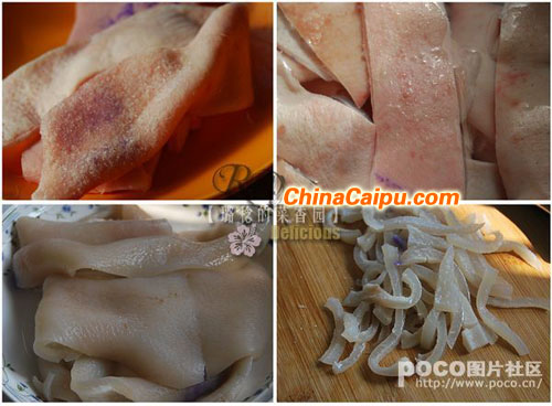 1、猪肉皮若干,洗净,放凉水锅煮开20分钟捞出,用夹子(把皮上的毛摘干净,这可是细活啊,一定要夹干净,同时将肉皮内面的脂肪层也刮干净。)