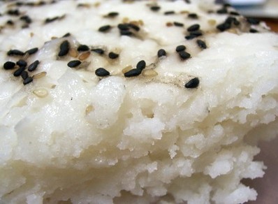 大米发糕做法:1.大米粉(有的地方叫粘米粉)适量白糖加冷水调成稀糊状,粉水比例为1:2.2.隔水加热,其间要不停的搅动,至到米糊出现颗粒状的形态时即可.(不要加热的太过太干,那样发酵时不容易膨胀,口感较干较紧)3.少许酵母粉用温水调开,米糊温度降到不烫手时,将酵母水调入调匀,倒入容器中密封发酵(我是放到饭盒里发的),天气热的话大概发五个小时就好了,看到米糊体积变大,表面有好些鱼眼泡时基本就可以了.4.面上洒熟芝麻,开水上锅,大火蒸25-30分钟即可.