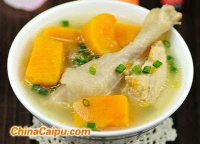 土鸡南瓜汤:南瓜含有维生素和果胶,果胶有很好的吸附性,能粘结和消除体内细菌,毒素和其它有害物质。原料土鸡一只,南瓜半个,姜,葱,盐,酒做法 鸡洗净,切块,焯水。南瓜去皮,籽,切块。鸡块放入锅内,加姜,酒,水没过鸡块,开了以后,小火煲2小时后,加南瓜,焖10分钟后,加盐调味,加葱段即可。很简单的做法,先将土鸡的味道煮出来后,再加其他原料可以使汤味道更加鲜美。此汤一般人都可以食用,肥胖者和中老年人尤其适宜。患有脚气,黄疸,感冒的人及大便燥节的人不宜食用。