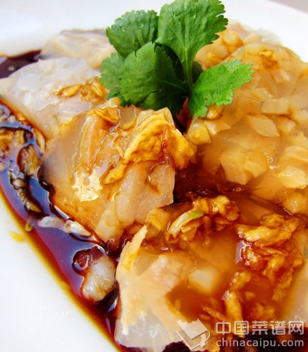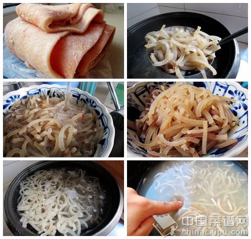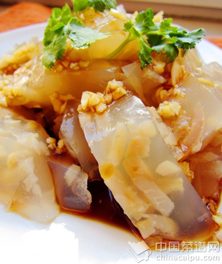 材料:猪皮300克、大蒜、香菜各适量调料:盐1小匙、高鲜酱油适量 做法:1.猪皮自然解冻,用热水烫软后,再处理表面的毛,洗干净切细条;2.大蒜切末,放小碗内,倒入酱油调成汁;3.锅内烧清水,冷水下猪皮,开锅后,捞出再过冷水冲一下;4.再次烧水,把之前过水的猪皮下锅,煮开后放盐,转小火慢熬2小时;5.待熬制半黏稠状时,关火放凉后,冷藏4小时,取出后切片,淋上蒜酱油即可食用。温馨小贴士:1.去除猪毛,热水烫软后,可用火撩猪皮表面,这样可去除猪皮上的毛,很方便。2.熬制时放盐是为了冷藏时凝固的更好,而且让猪皮有点底味。