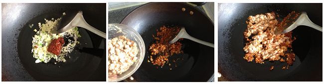 3、肉末提前用少许生抽、黄酒和淀粉抓匀腌制半小时。重新起锅坐油,放入葱姜蒜末和泡椒豆瓣酱,小火慢慢炒出香味和红油,放入肉末继续小火炒至完全变色。