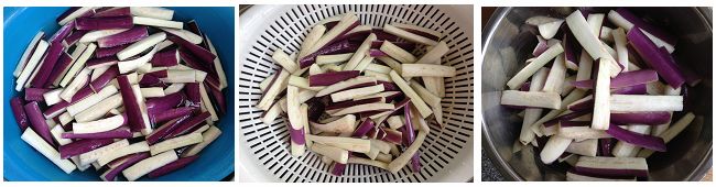1、茄子洗净切长条,用淡盐水浸泡1小时沥干水分,洒薄薄一层淀粉。