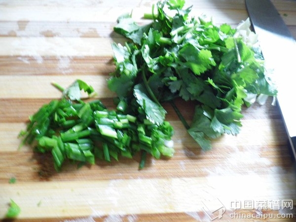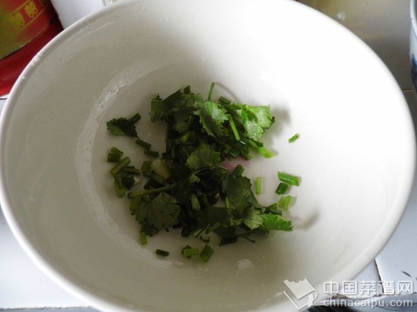 12.碗里放入香菜和小葱末,加入牛肉汤盛碗中