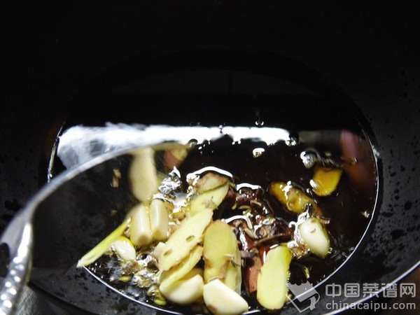 5.锅里热油,油热后关小火加姜、蒜和所有香料炒香