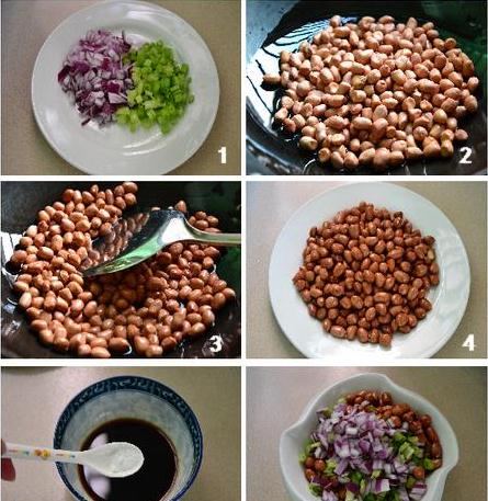 ⑥待花生米彻底冷却后,放入芹菜洋葱粒,再倒入味汁拌匀,泡制半小时即成。