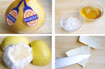 2、将柚子表皮切下,将柚子皮和柚子肉中间的白色部分去掉,切成细丝,放入淡盐水中浸泡15分钟