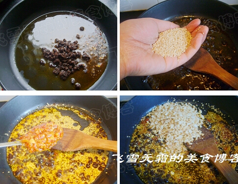 5,锅中放蒜蓉香辣油,倒入豆豉先爆香