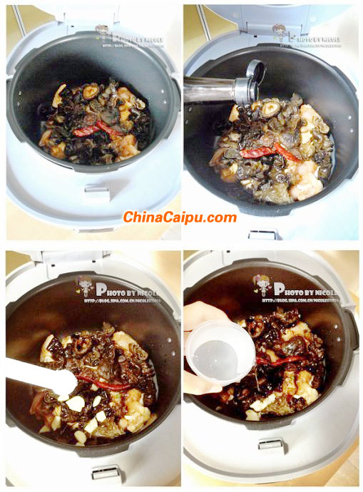 4.将腌制好的鸡肉连同腌制的料汁一起倒入压力煲;