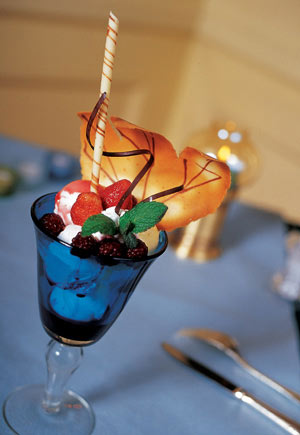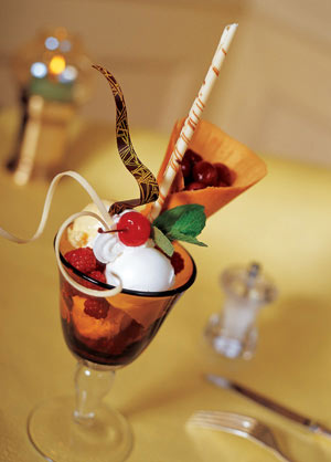 健康提示:冰淇淋可任选个人喜爱的口味,适当讲究色彩的对比;可可粉可以用巧克力粉或糖粉替代。