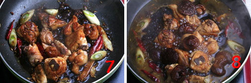 8、倒入煮开的香菇水和香菇,开锅盖盖改小火焖30分钟、加盐、黄冰糖调味。
