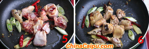 5、放入腌好的鸡块煸炸出香味,