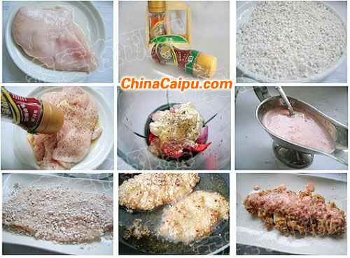 材料:鸡胸肉 颗粒红薯粉 味美现磨黑胡椒粉 蘸酱料:粗粒黑胡椒粉 洋葱 色拉酱 蜂蜜 甜红椒做法:1、鸡胸肉洗净去掉表面的筋薄,片成3片,用料酒、盐、糖和黑胡椒腌制片刻2、将蘸酱料放入料理机打碎备用3、腌制好的鸡肉拍上颗粒红薯粉,再用手压实4、锅内入油5成热,放入鸡肉转中小火炸熟盛出5、接着再开大火将鸡肉放入复炸一次至金黄酥脆 6、切片装盘,将现磨黑胡椒逆时针转,磨出颗粒黑胡椒撒在鸡排上,食用时候浇上酱料即可