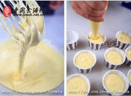 6.装入裱花袋内挤入模具杯内8分满,搅拌均匀。