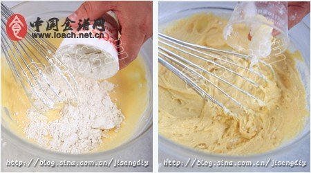 4.将过筛的低筋粉和乳化剂一起加入打发。