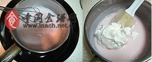 3.关火后将1大勺玫瑰水和2滴色素倒入2中搅匀