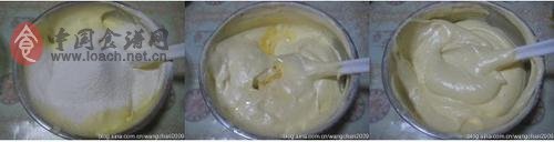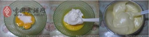 2,蛋黄加糖隔水加热打至变浅,分次加入蛋白混合