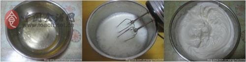 1,蛋白先加几滴白醋打至粗泡,再一次性加了糖打至中性偏干状态