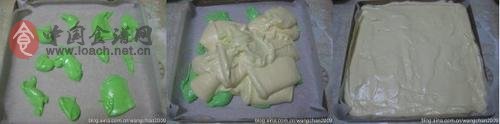 4,取小少面糊,加入几滴班兰香精,随意倒在油纸上,倒入原味原糊,抹平表面